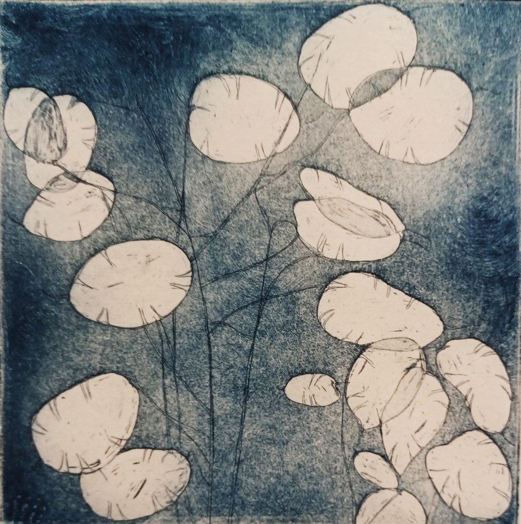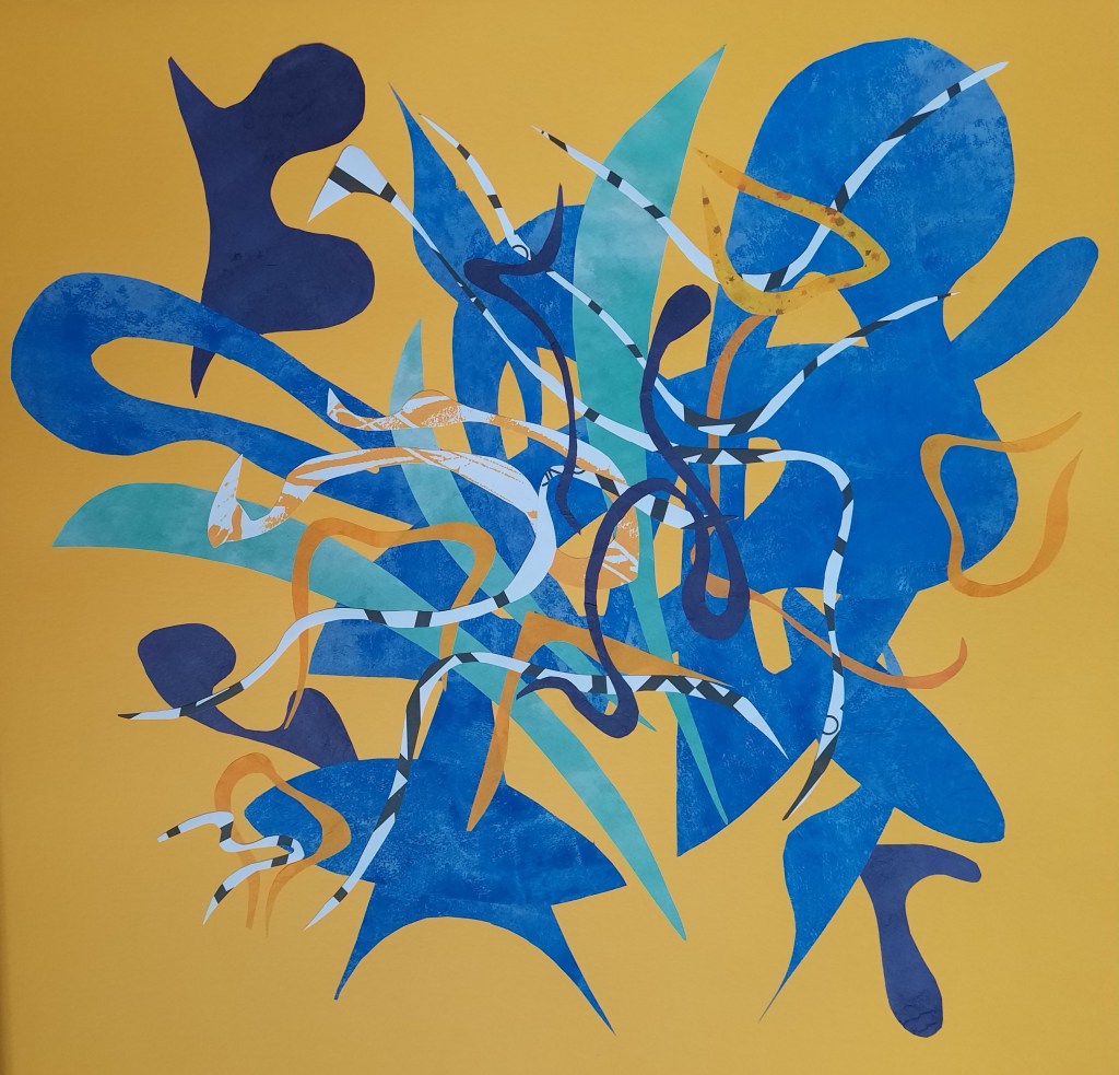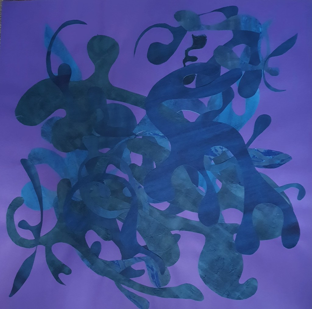 Because this year there were no fireworks: Mixed papers and acrylic ink on Canford paper,42 x 42 cm.Mood Indigo, mixed papers and acrylic ink on Canford paper. 59 x 59cm. Greening: Mixed papers and sheet music on Canford paper, 55cm x 42cm