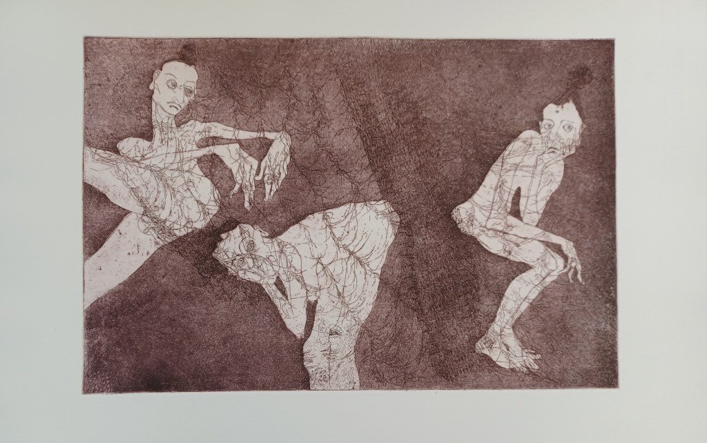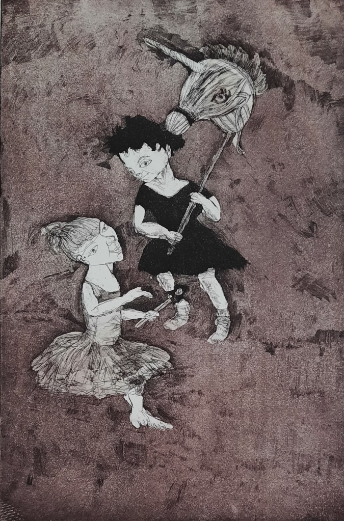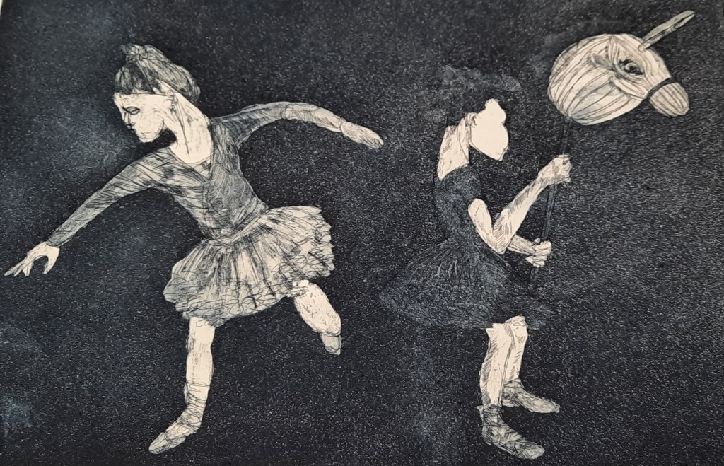 Tutu Girls#2: 19.5 x 29.5cm, on Hahnmuhle paperTutu girls#3: 29.5cmx19.5cm, on Hahnmuhle paperJourney Around Renna: Etching with aquatint, image size 20×29.5cm
