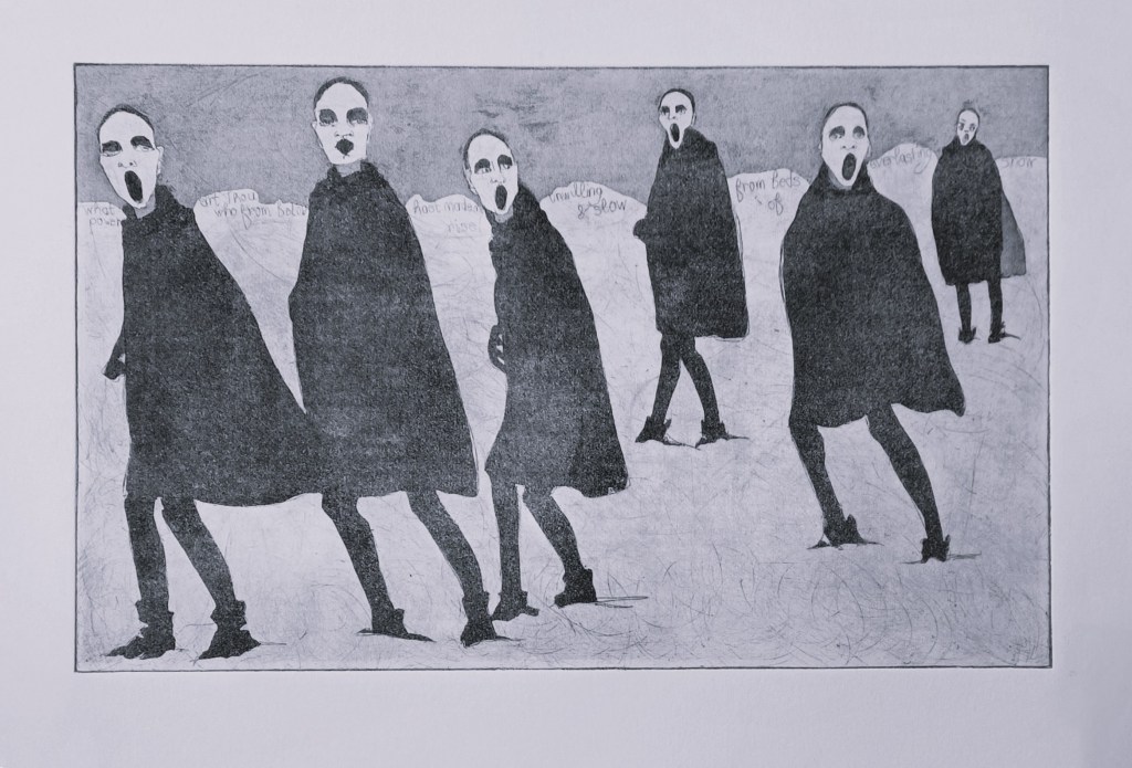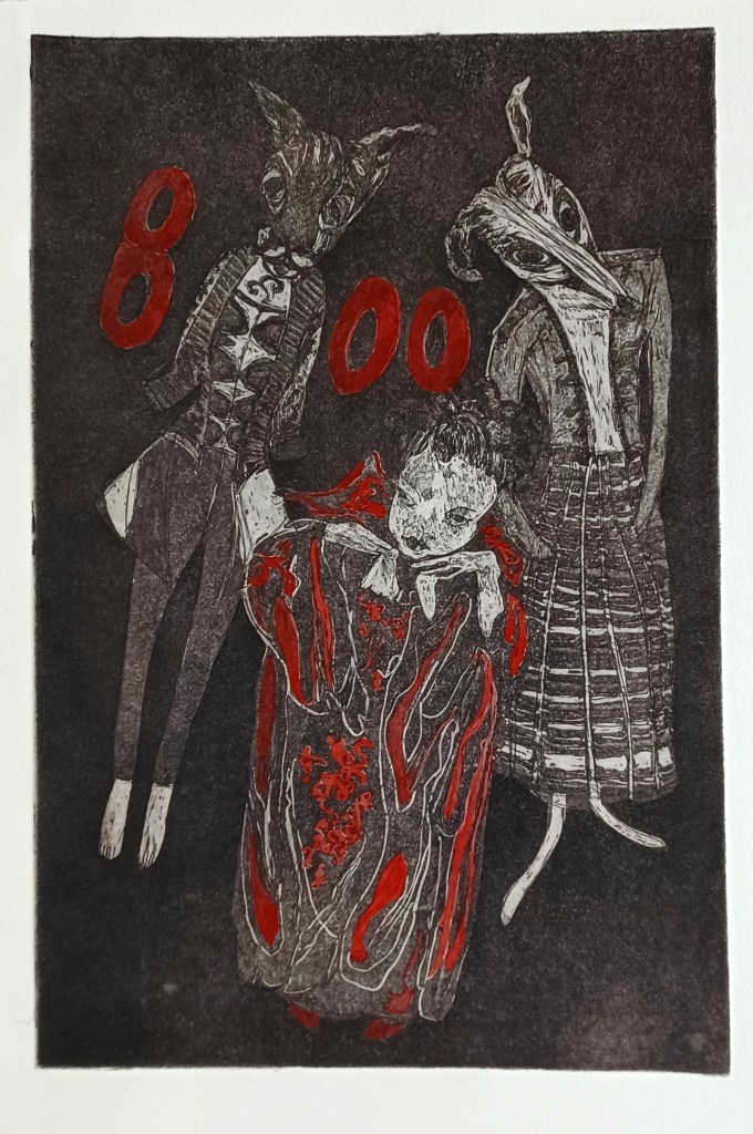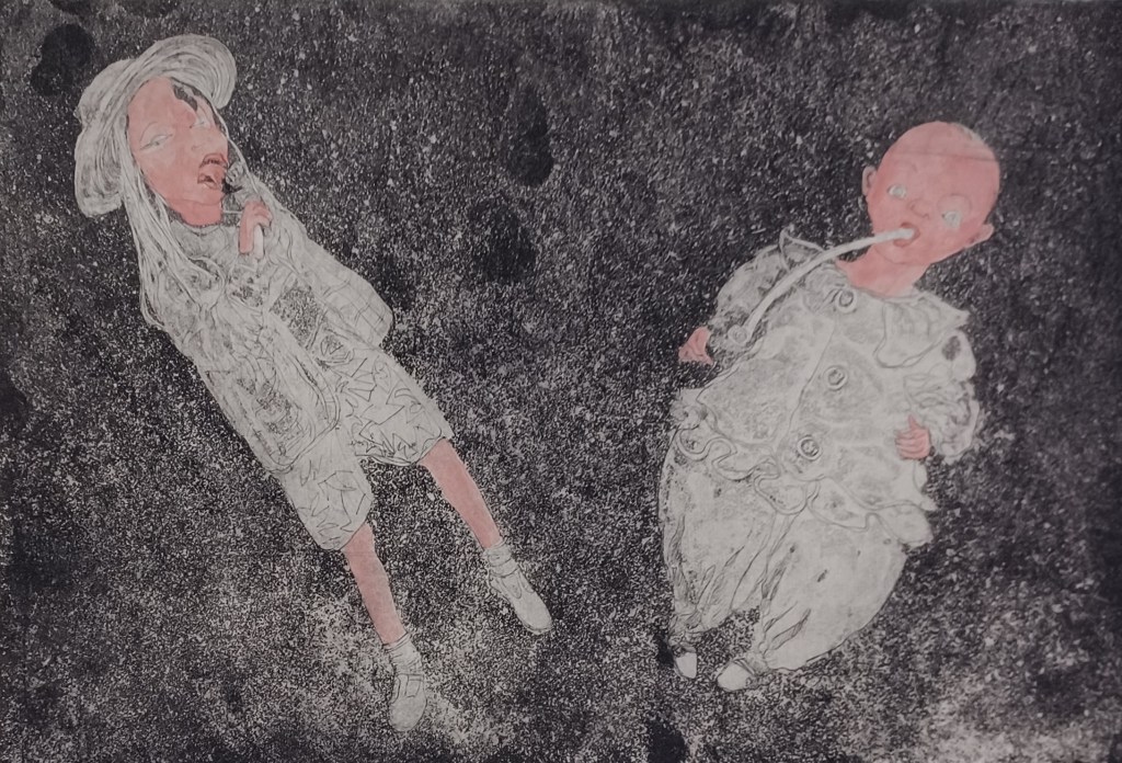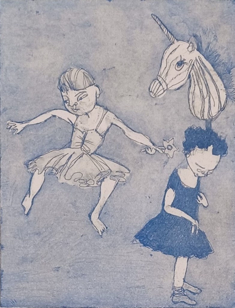 Tutu Girls#1: 19.5 x 15.cm, on Hahnmuhle paperTutu girls#3: 29.5cmx19.5cm, on Hahnmuhle paperJourney Around Renna: Etching with aquatint, image size 20×29.5cm